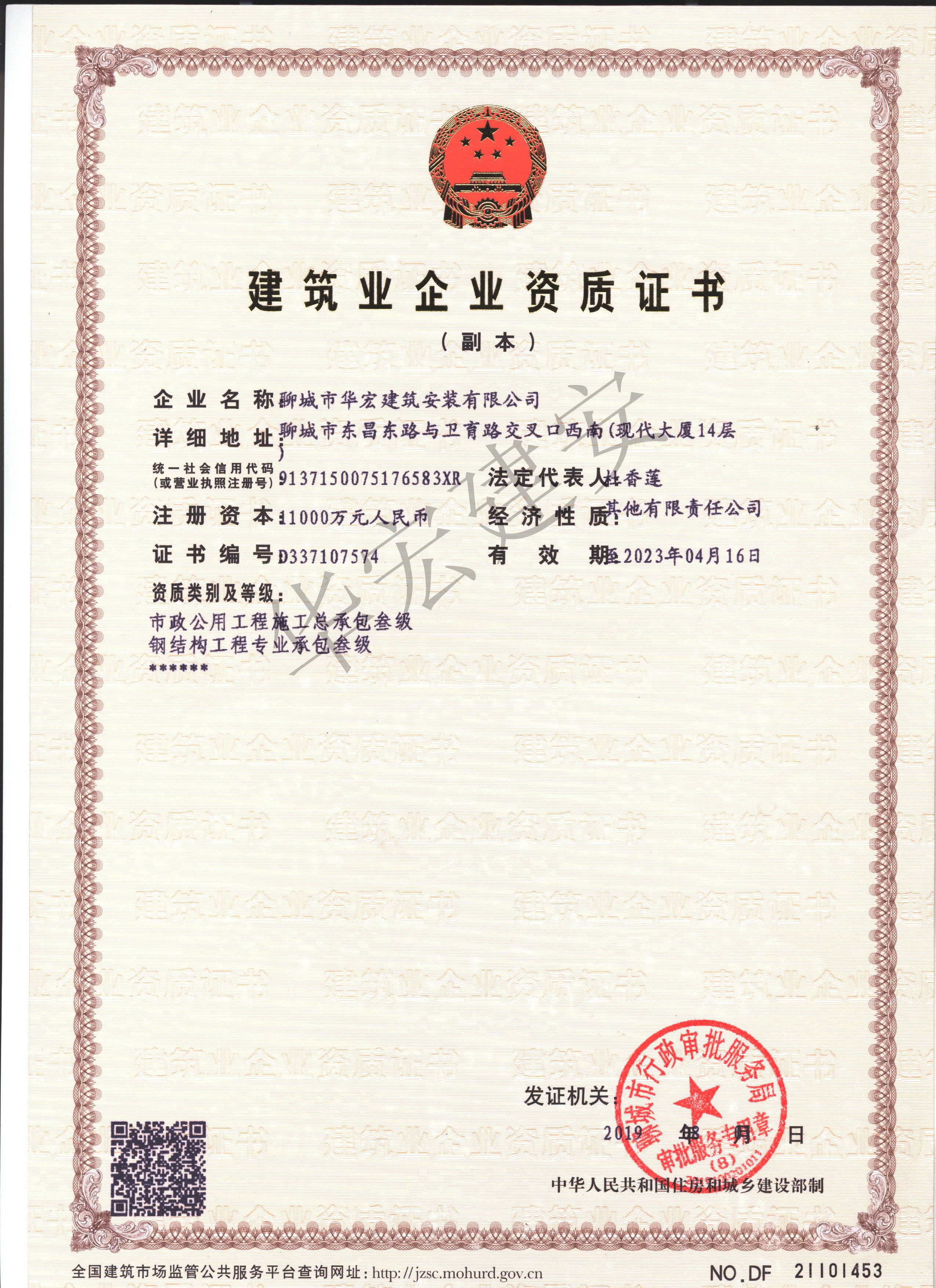 聊城市華宏建筑安裝有限公司成立于2002年5月,公司自2002年成立以來,不斷發(fā)揚 “敬業(yè)修身 打造精品 開拓創(chuàng)新 弄潮勇進”的創(chuàng)業(yè)精神,始終遵循“以質量求生存、靠精品創(chuàng)品牌、憑信譽贏市場”的宗旨,認真奉行“科學 高效 一流”的質量方針